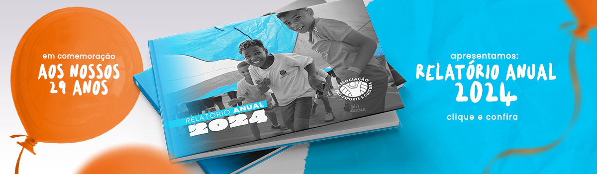 Banner"Relatório Anual 2024"de uma organização esportiva, celebrando 29 anos, com crianças correndo e sorrindo.